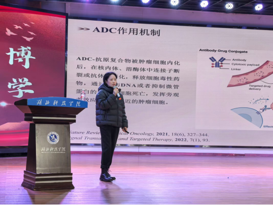 本次宣讲以“谈癌不必色变,聊聊科学防治——抗体偶联药物(ADCs)在癌症治疗中的应用”为主题,李满博士从影响人类健康的重大疾病——癌症切入,介绍癌症类型、引发的原因、癌细胞特点及目前常见治疗方法,重点介绍了抗体偶联药物,通俗地解释了其作用原理、靶向精准治疗的机制以及研究进展。