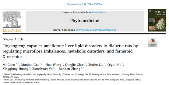 近期,我院张丹丹博士在湖北省自然科学基金(基金号:2023AFB513)的经费支持下,采用糖尿病大鼠模型,从法尼类X受体(FXR)、肠道菌群及多组学多角度结合研究了金刚藤胶囊降血糖的作用机制。研究内容及结果如下:采用液质联用技术在金刚藤胶囊(JGTC)中鉴定了33种化合物,药效学结果显示,JGTC可以降低糖尿病大鼠血糖、血脂、天冬氨酸转氨酶、丙氨酸转氨酶和脂质积累的水平。通过16S rDNA测序发现,JGTC提高了糖尿病大鼠肠道菌群的物种丰富度和多样性,可以调节22种失衡的肠道菌群。粪便代谢组学分析显示,JGTC主要调节了组氨酸、牛磺酸、低牛磺酸、色氨酸、磷脂甘油、精氨酸等代谢物。血清代谢组学分析表明,JGTC主要调节了甘油磷脂、果糖和甘露糖、半乳糖、亚油酸、鞘脂、组氨酸、缬氨酸、亮氨酸和异亮氨酸的生物合成以及色氨酸代谢。分子生物学分析表明,JGTC治疗升高了糖尿病大鼠肝脏中FXR表达,抑制了脂肪生成基因(Srebp1c和FAS)以及炎症相关基因(白细胞介素(IL)-β、肿瘤坏死因子-α和IL-6)的表达,同时结合肝脏代谢组学分析表明,JGTC可显著调节大量与FXR相关的胆汁酸代谢物。