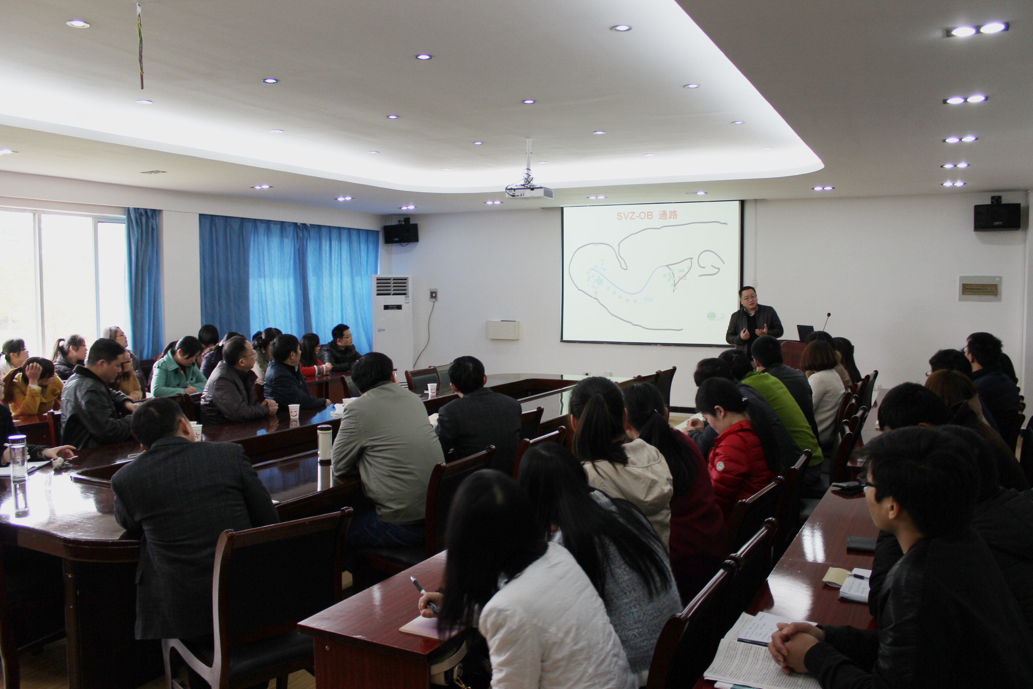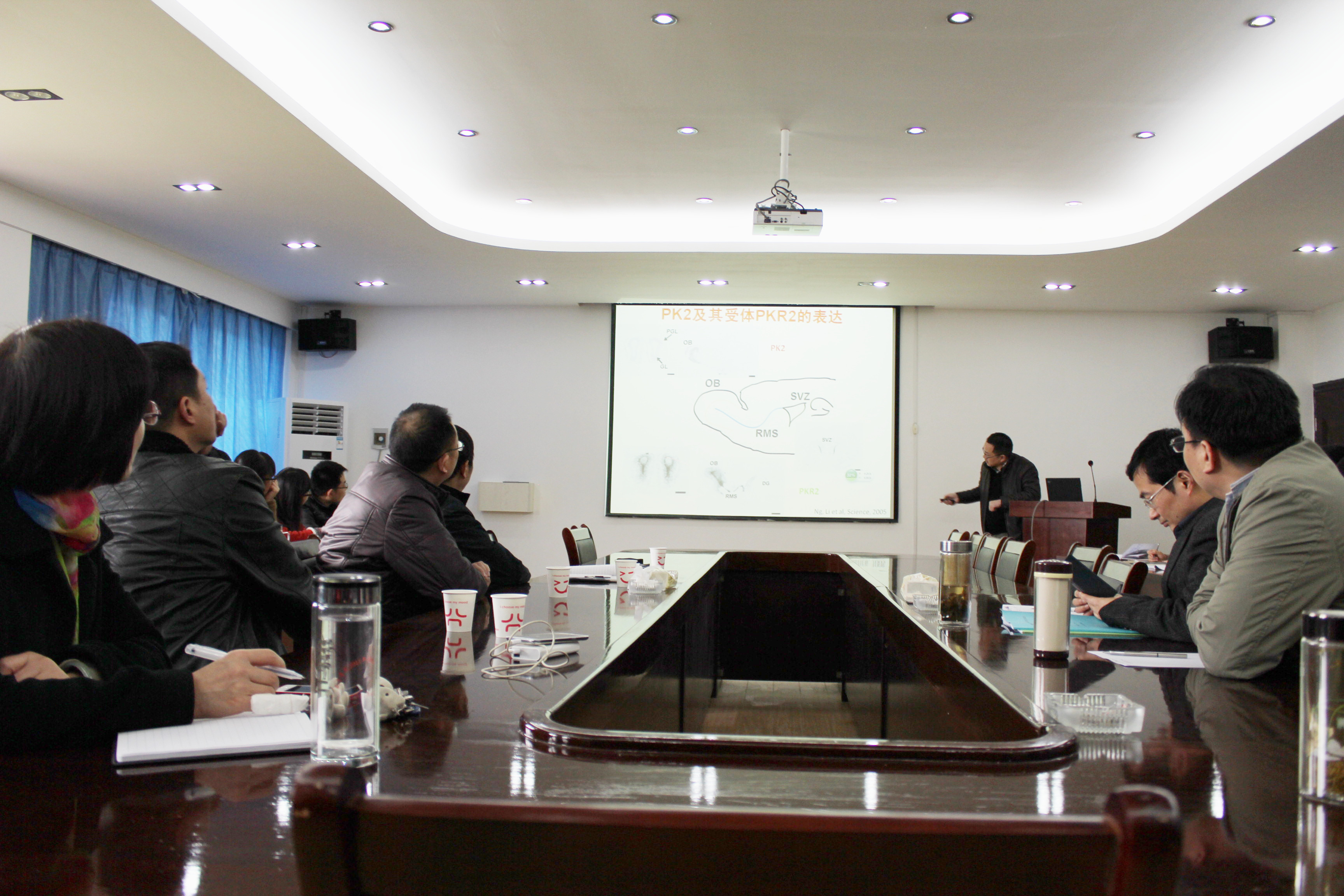 2015年4月9日 ,下午三点,来自中南大学的李家大教授莅临我校做了主题为“G蛋白偶联受体PKR1/2功能研究”的学术报告,beat365在线唯一官网院长黄胜堂、党支部书记闵清等领导和老师以及相关专业研究生参加了此次讲座。